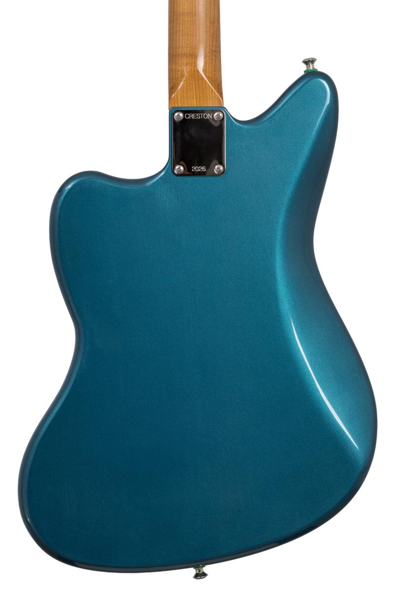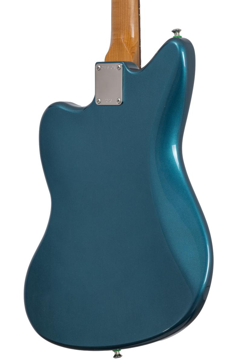Kyle's new guitar: torrefied alder body, torrefied quartersawn maple / Indian rosewood neck, linen micarta pickguard, Lollar Regal and JM pickups, Mastery bridge and vibrato, push-push series switching, metallic green lacquer. Yes, green.