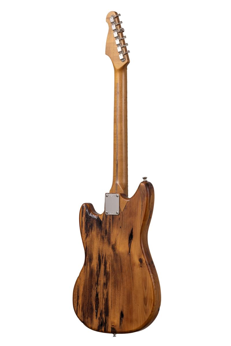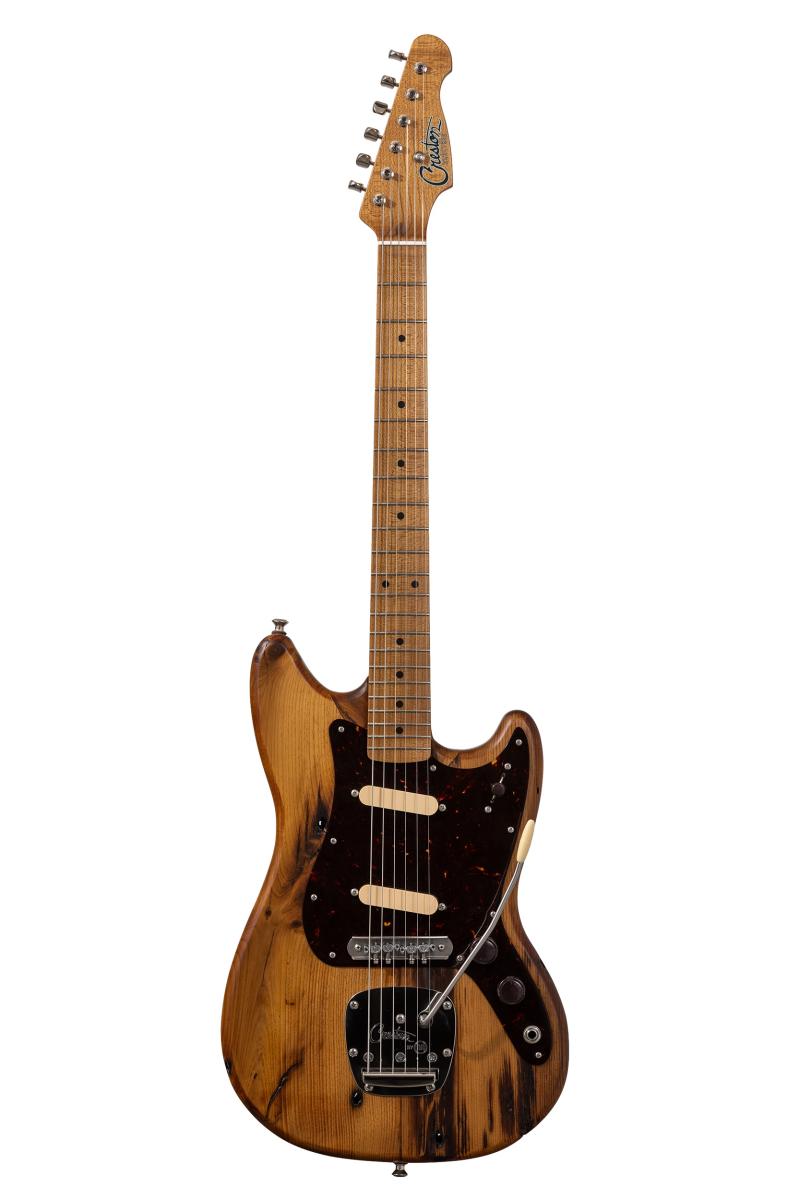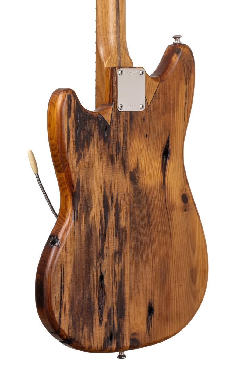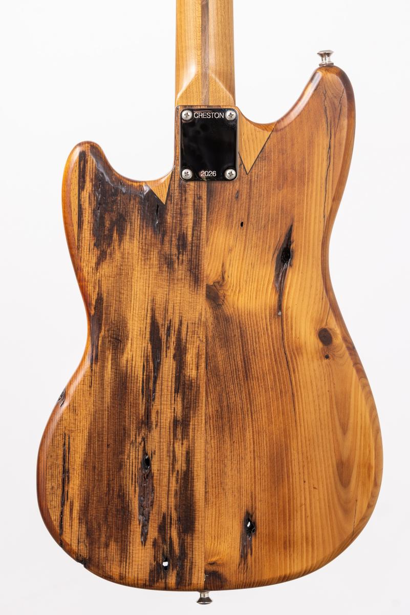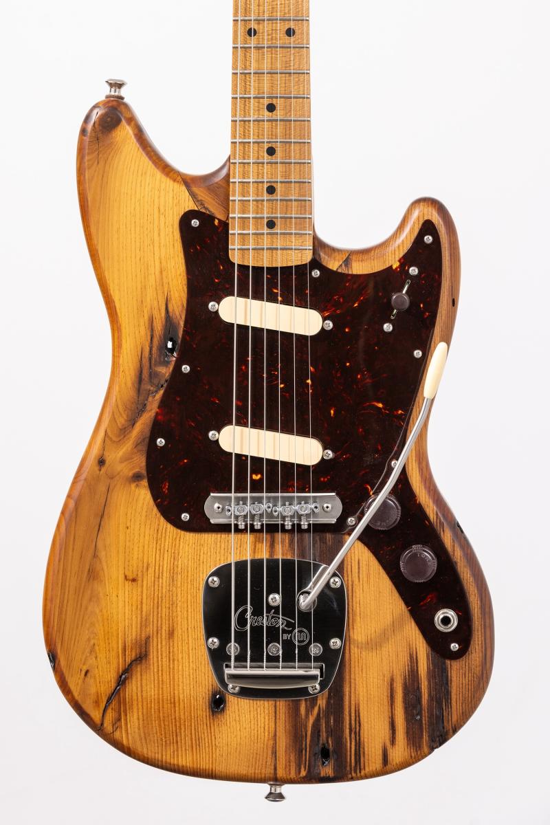 Nitsuh Abebe's guitar: 24" scale, torrefied salvaged white pine body, torrefied quartersawn maple neck, celluloid tortoise pickguard, Lollar Special Mustang pickups, Mastery bridge and vibrato, vintage bakelite switch knobs, radio knobs. 5-way switching: bridge / series+phase / parallel / series / neck