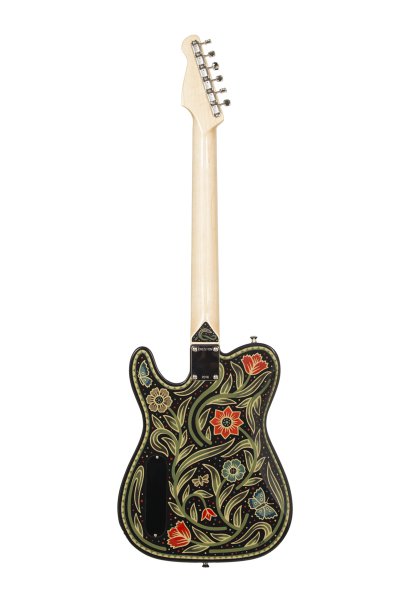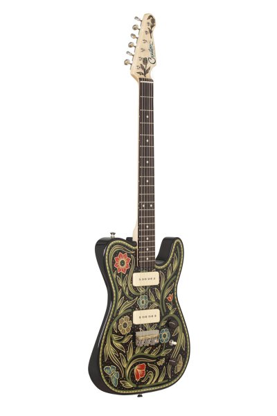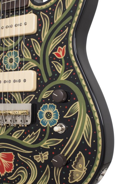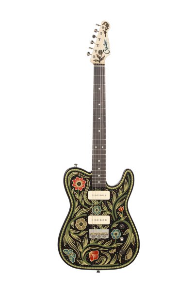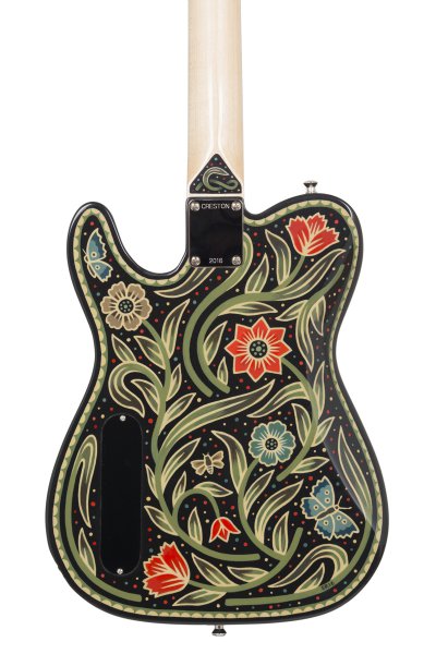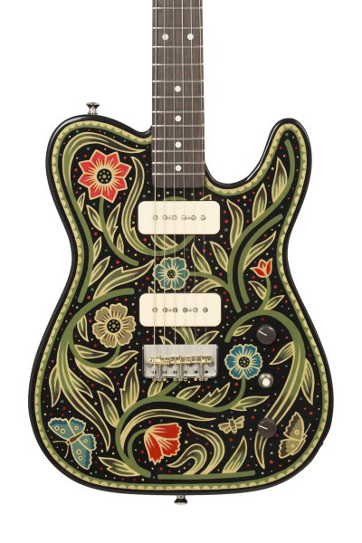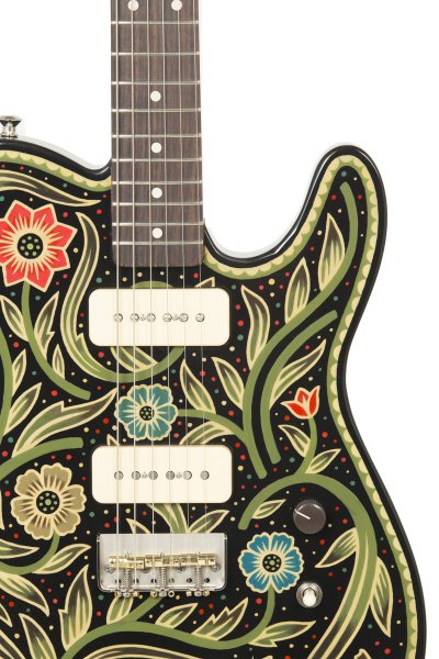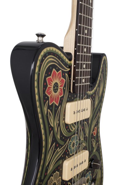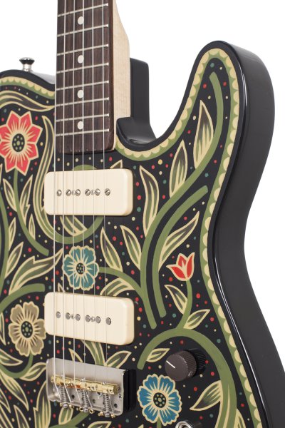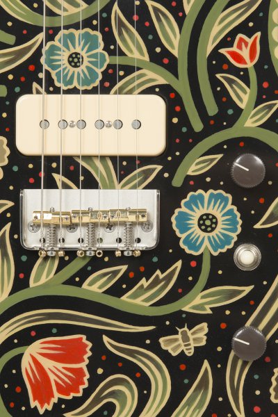 Lindsay Martin's guitar: 1-pc ash body with belly contour, wide maple / Indian rosewood neck, Lollar 1950's-wind P90 neck and Lollar LEA-90 bridge. Sarah Ryan paint.