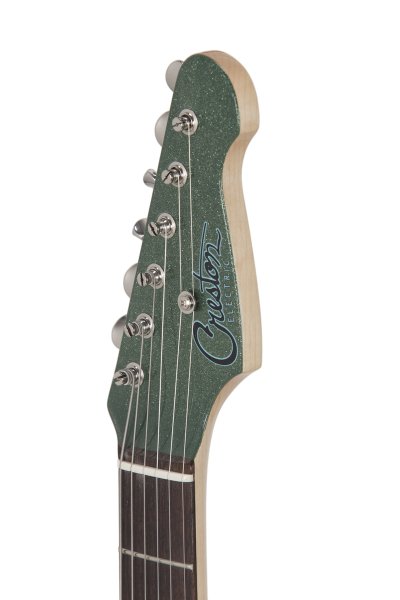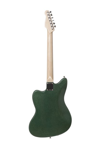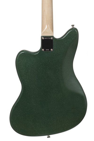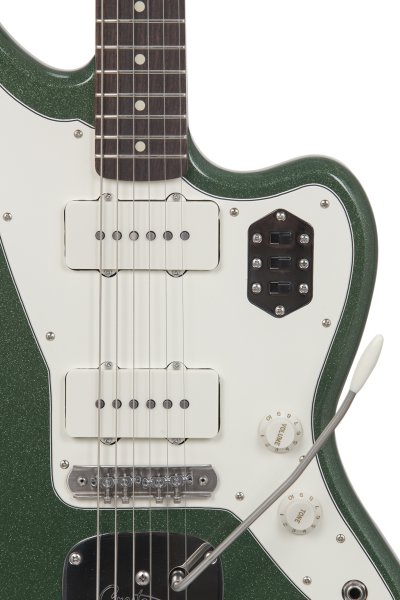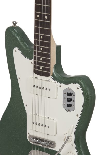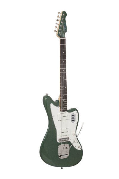 Ash body, maple / rosewood neck, Lollar Jazzmaster pickups, Mastery hardware, pickup on/off switches + strangle switch, metallic green lacquer.