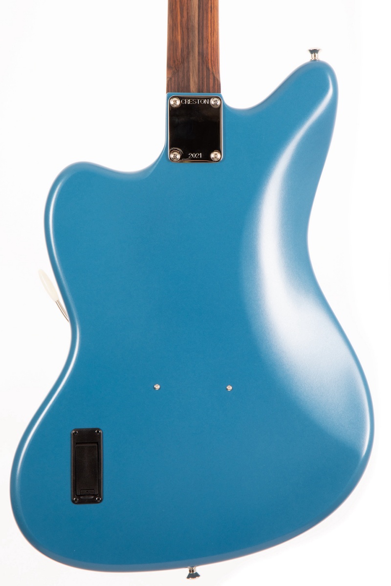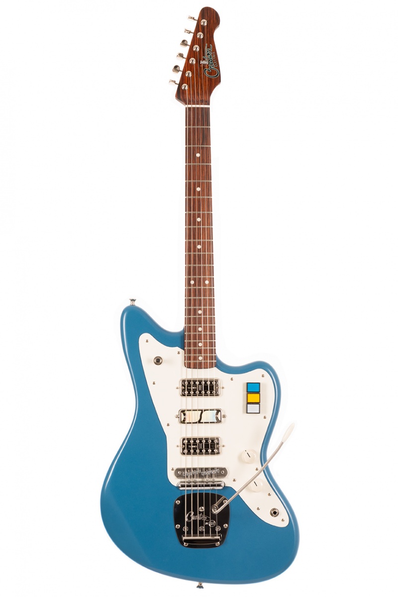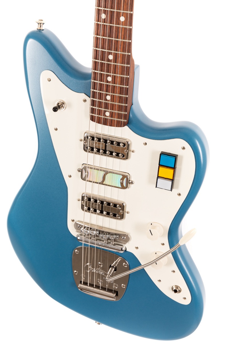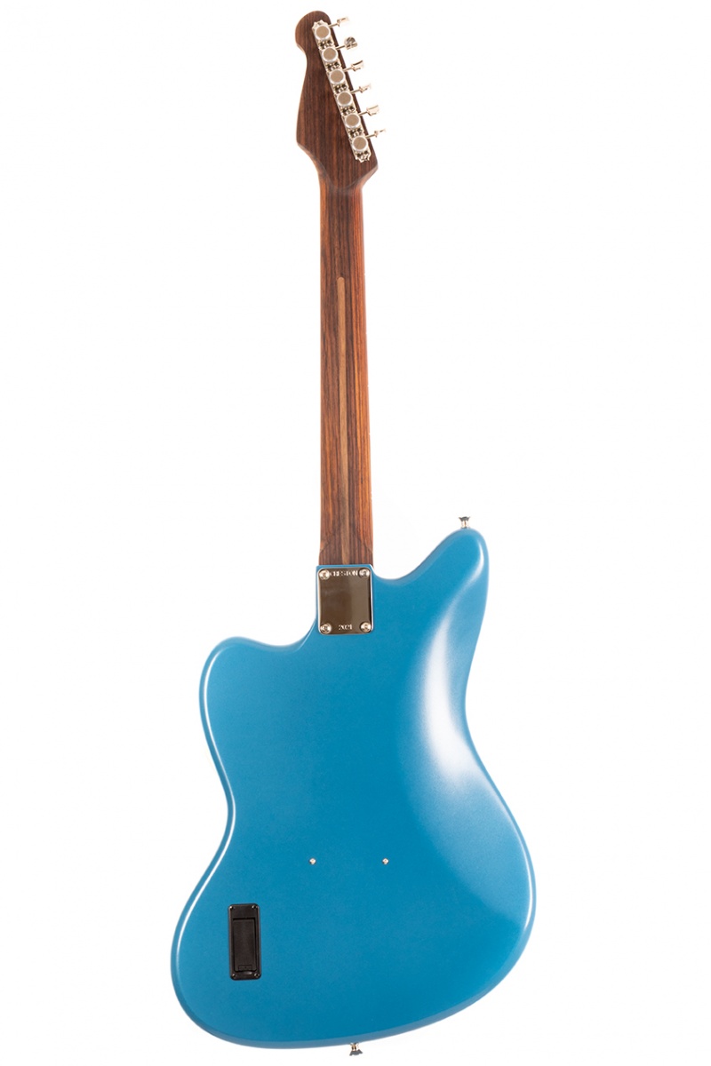 Andrew Hensley's guitar: 24-3/4" scale, torrefied sugar pine body, 1-pc Indian rosewood neck, TV Jones Power'Tron (b) and TV Classic (n), Curtis Novak Dearmond Gold Foil (m), and behind-the-bridge lipstick pickups, Mastery hardware, flat metallic blue nitrocellulose lacquer, 1-ply pickguard, three illuminated pushbutton switches - n+b on/off, m on/off, lipstick on/off. There's a short video demo about the lipstick pickup