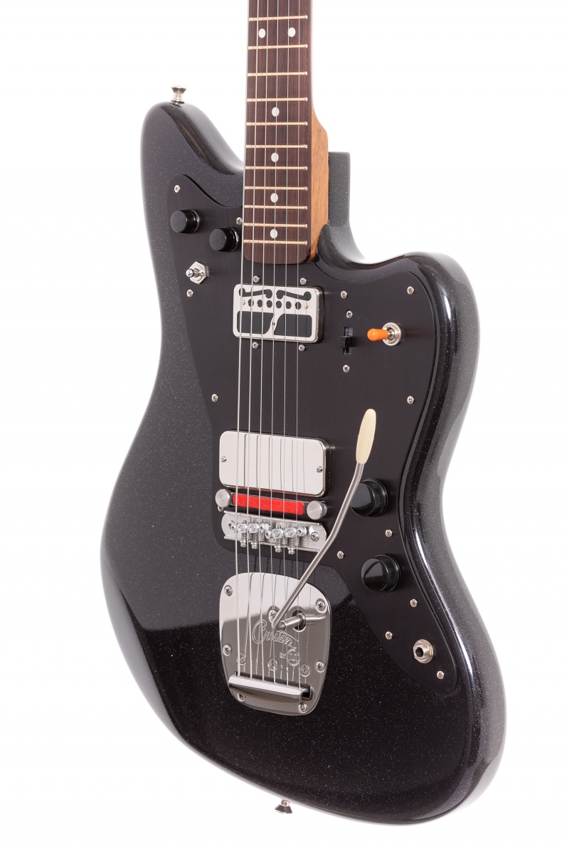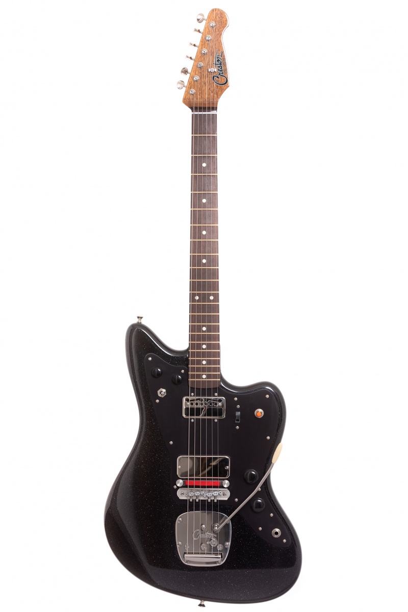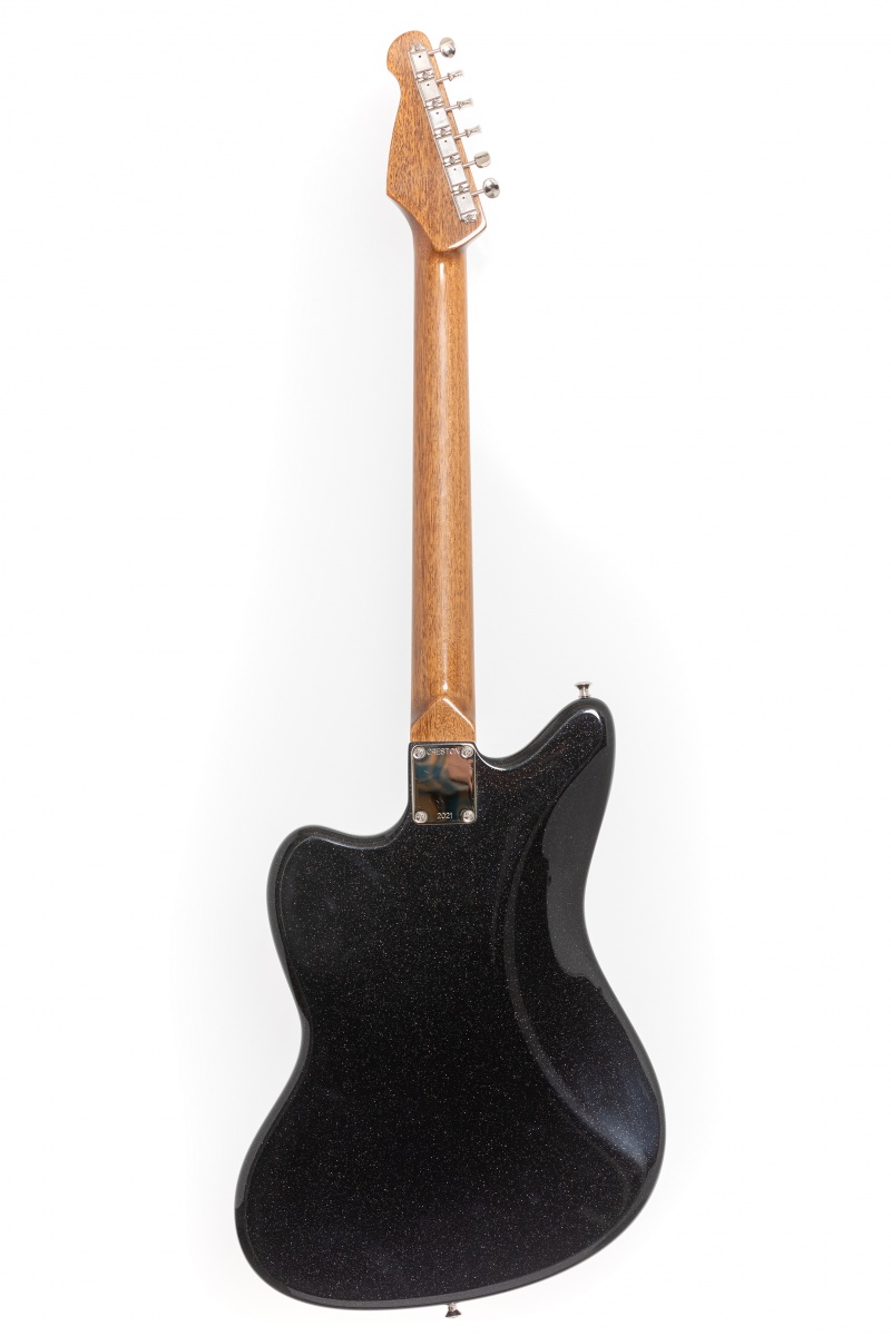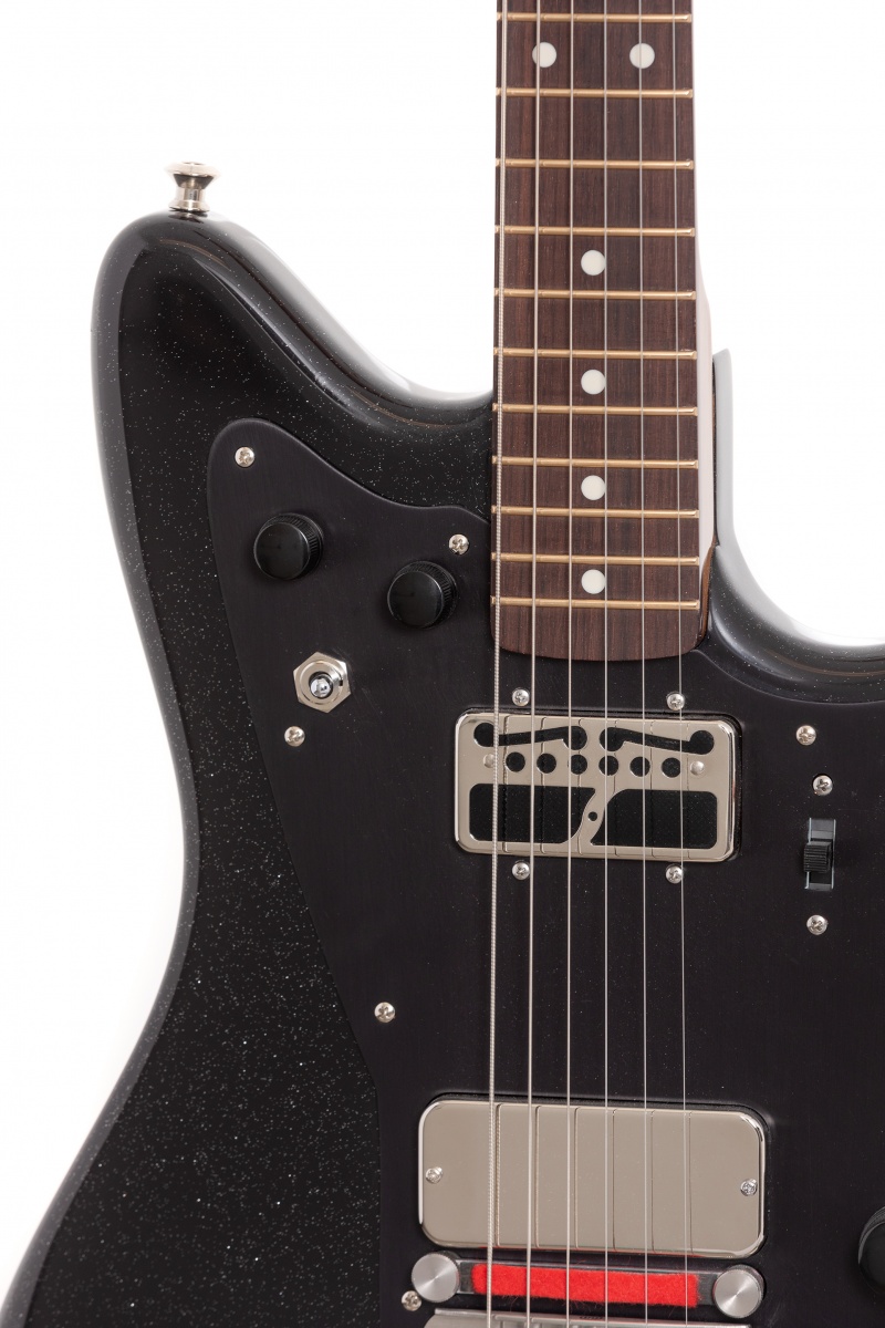 Andrew Hulett's guitar: torrefied alder body, mahogany / Indian rosewood neck, anodized aluminum pickguard, Curtis Novak prototype dual-foil and Thunderbird Bass pickups, Mastery hardware, and switching that works like so: three-way (Guyatone/series/Dearmond) slider for the neck pickup's coils, normal (pickup selector, volume, tone, output) vs alternate signal flow toggle. Alternate cicuit: independent volume control, push-pull fixed .01 tone capacitor, bass cut control, output). Lost? I was as I made this video, but follow along and you'll get the idea. Oh, and a mute! There's an adjustable mute! And silver metal flake over black nitrocellulose lacquer.