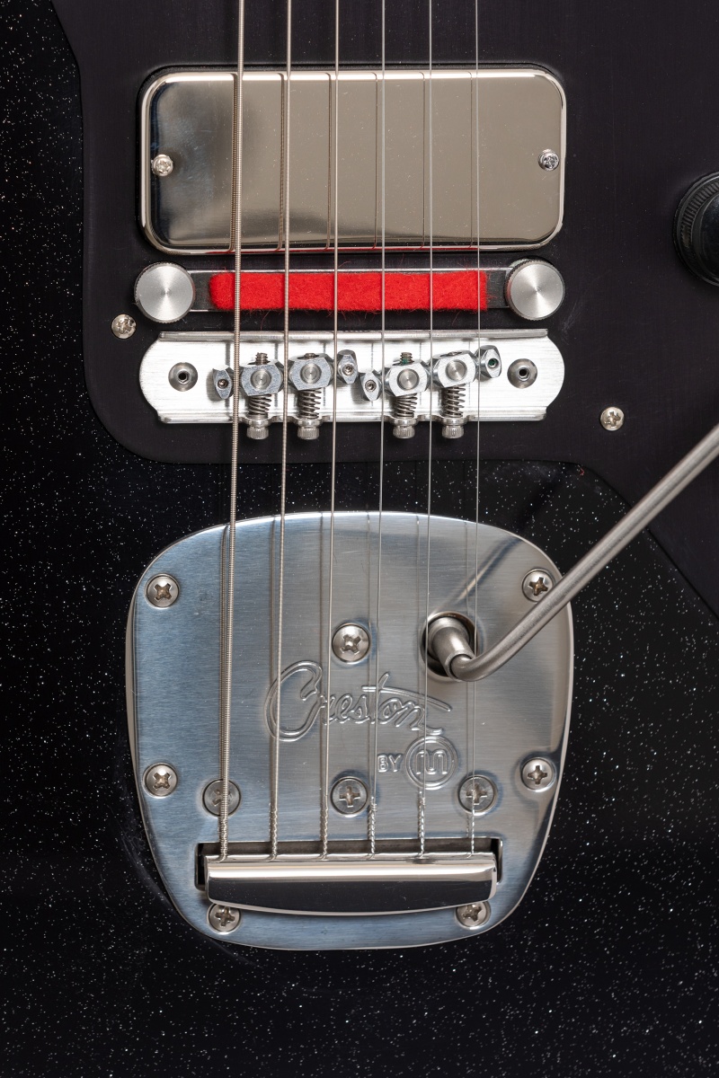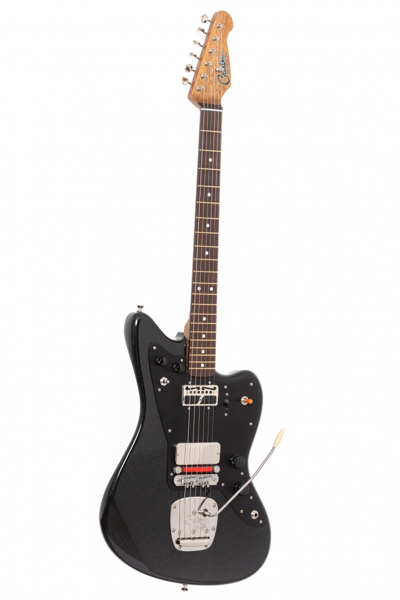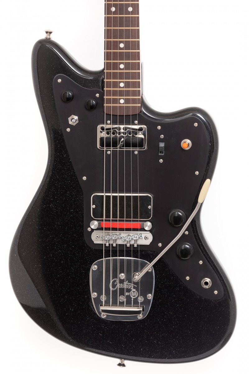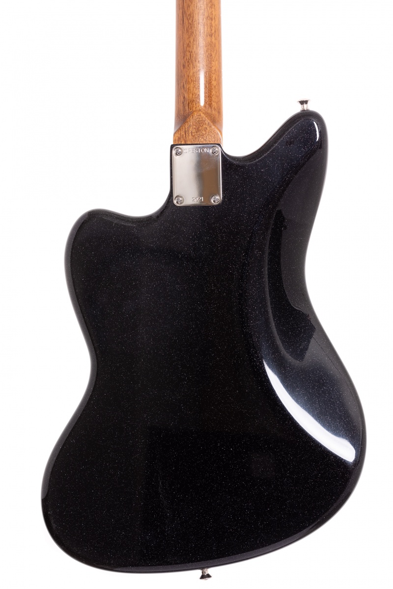 Andrew Hulett's guitar: torrefied alder body, mahogany / Indian rosewood neck, anodized aluminum pickguard, Curtis Novak prototype dual-foil and Thunderbird Bass pickups, Mastery hardware, and switching that works like so: three-way (Guyatone/series/Dearmond) slider for the neck pickup's coils, normal (pickup selector, volume, tone, output) vs alternate signal flow toggle. Alternate cicuit: independent volume control, push-pull fixed .01 tone capacitor, bass cut control, output). Lost? I was as I made this video, but follow along and you'll get the idea. Oh, and a mute! There's an adjustable mute! And silver metal flake over black nitrocellulose lacquer.