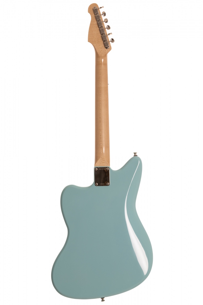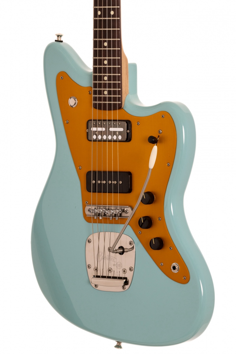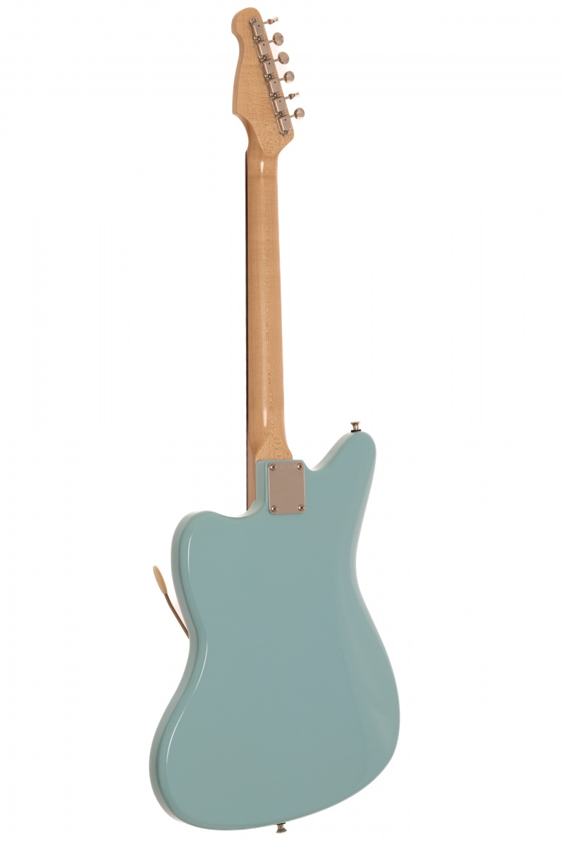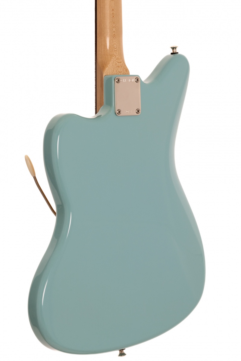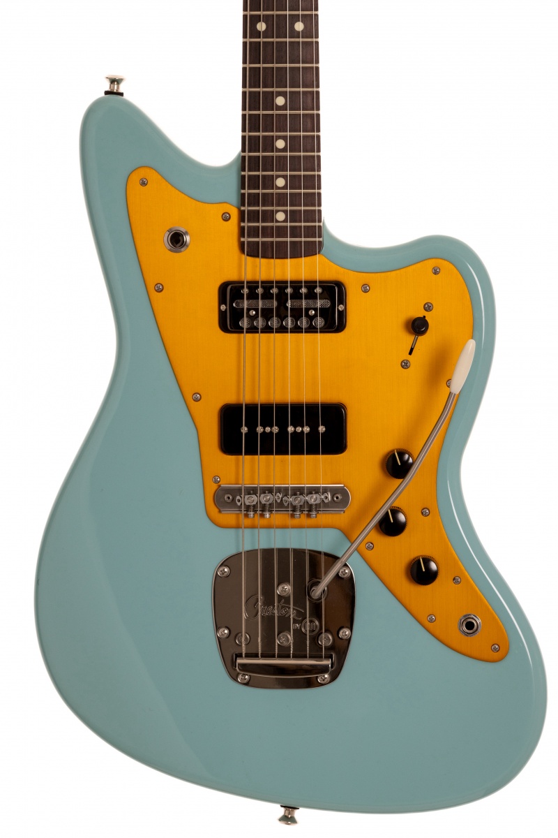 Andrew Missel's latest guitar: 24" scale, torrefied alder body, quartersawn maple / Indian rosewood neck, anodized aluminum pickguard, Lollar Gold Foil (well, black chrome / silver foil) and P90 pickups, 4-way switch (with series), pushbuton high pass filter, volume / tone / tone, Mastery hardware.