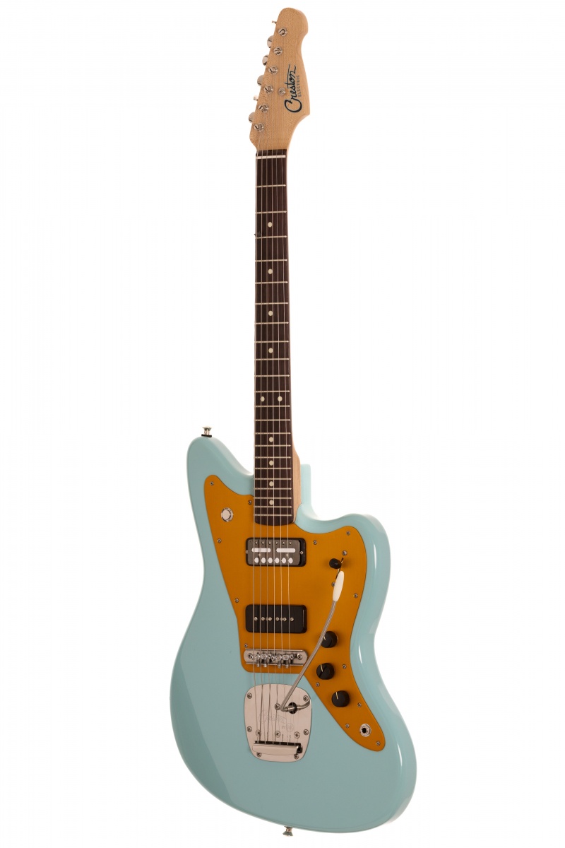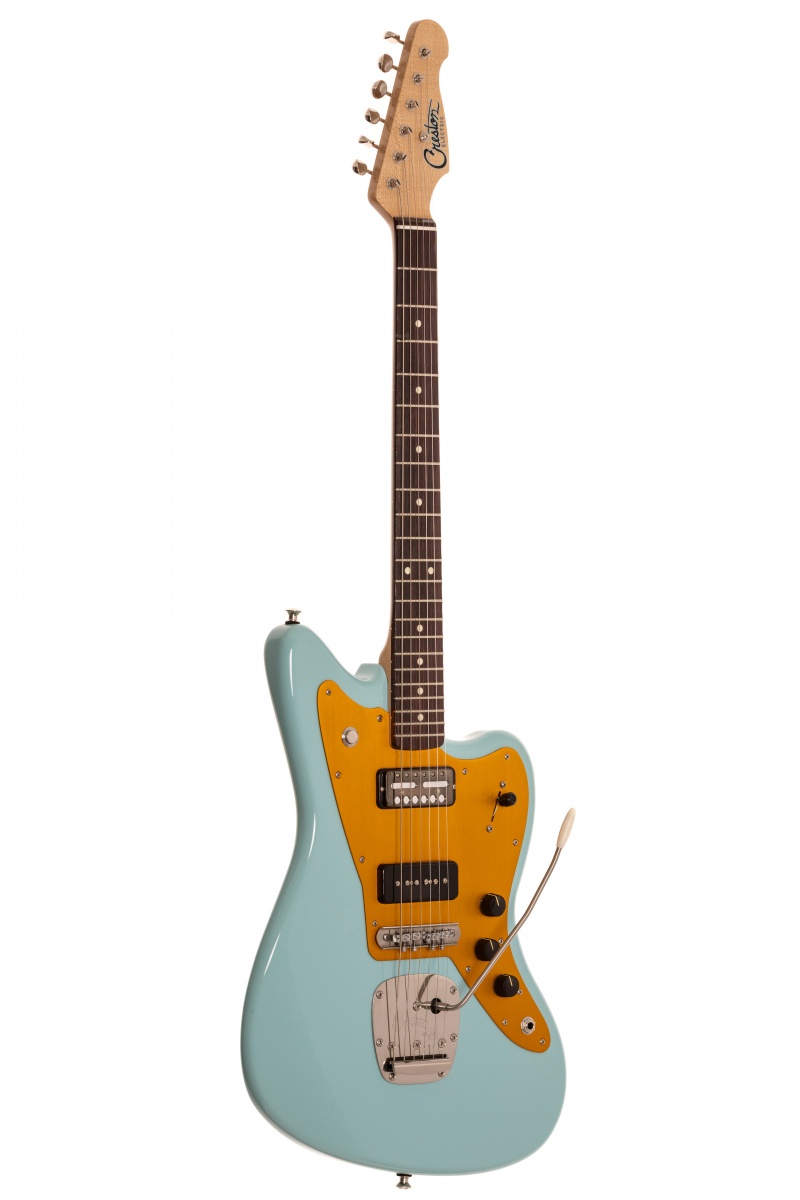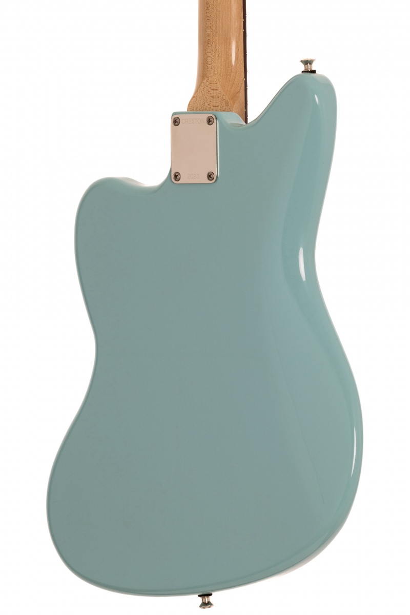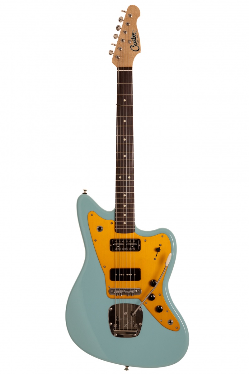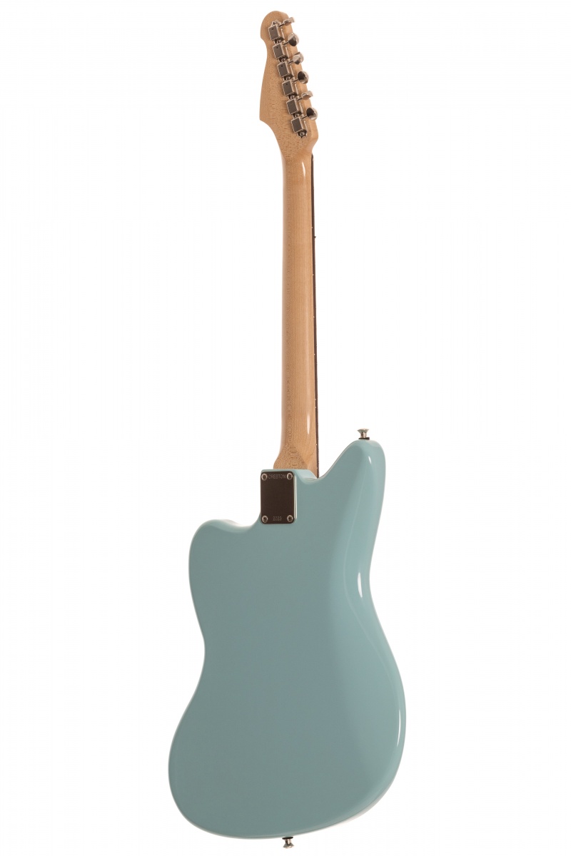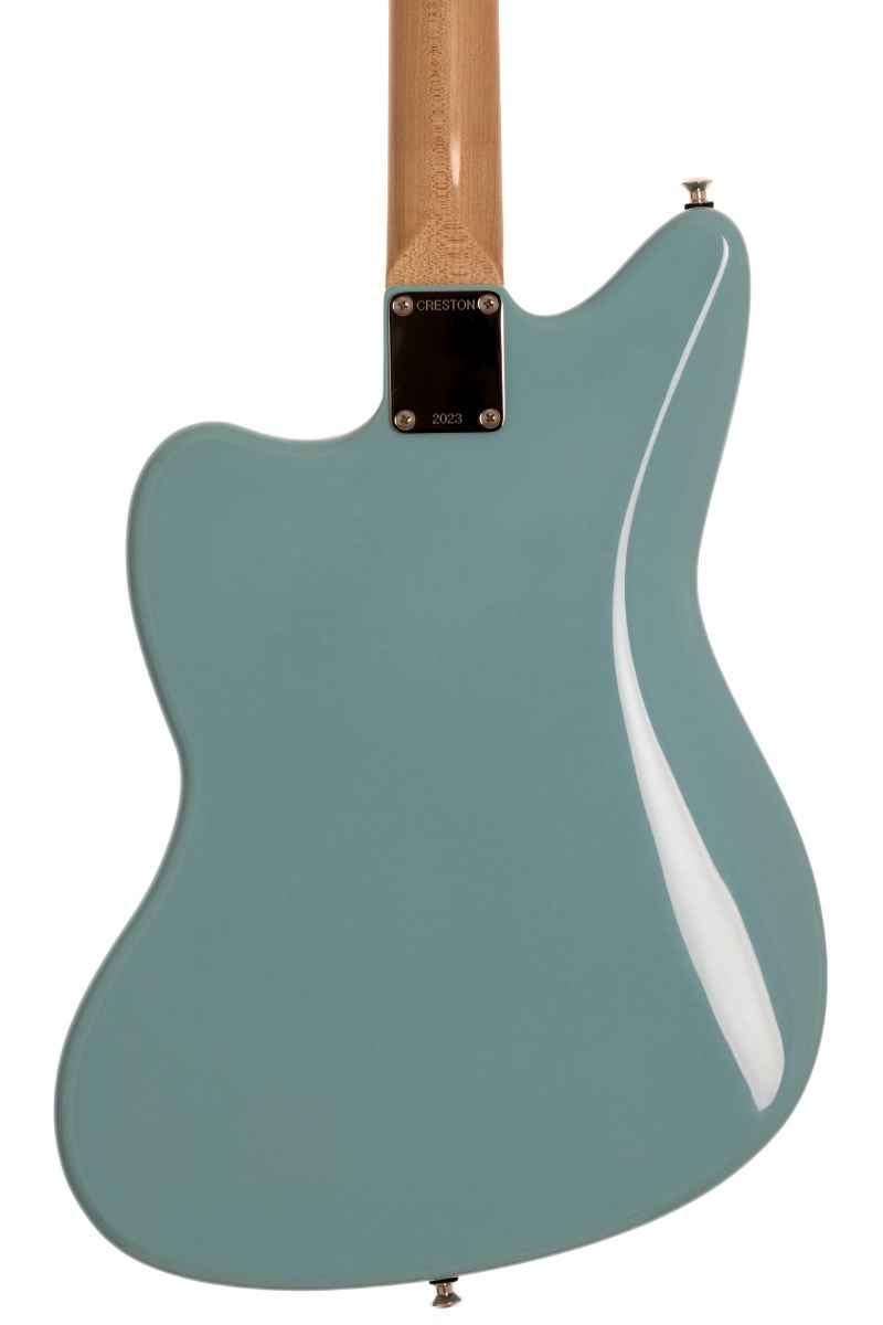 Andrew Missel's latest guitar: 24" scale, torrefied alder body, quartersawn maple / Indian rosewood neck, anodized aluminum pickguard, Lollar Gold Foil (well, black chrome / silver foil) and P90 pickups, 4-way switch (with series), pushbuton high pass filter, volume / tone / tone, Mastery hardware.