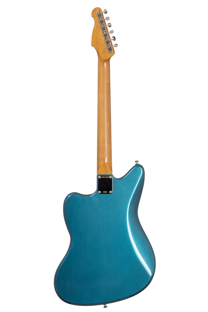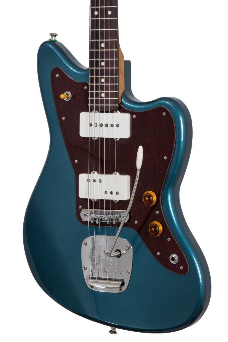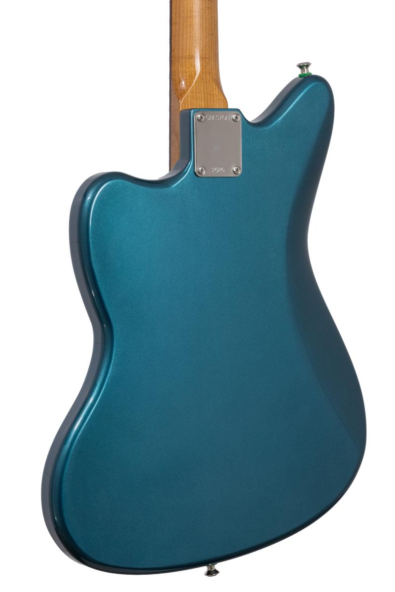 Kyle's new guitar: torrefied alder body, torrefied quartersawn maple / Indian rosewood neck, linen micarta pickguard, Lollar Regal and JM pickups, Mastery bridge and vibrato, push-push series switching, metallic green lacquer. Yes, green.