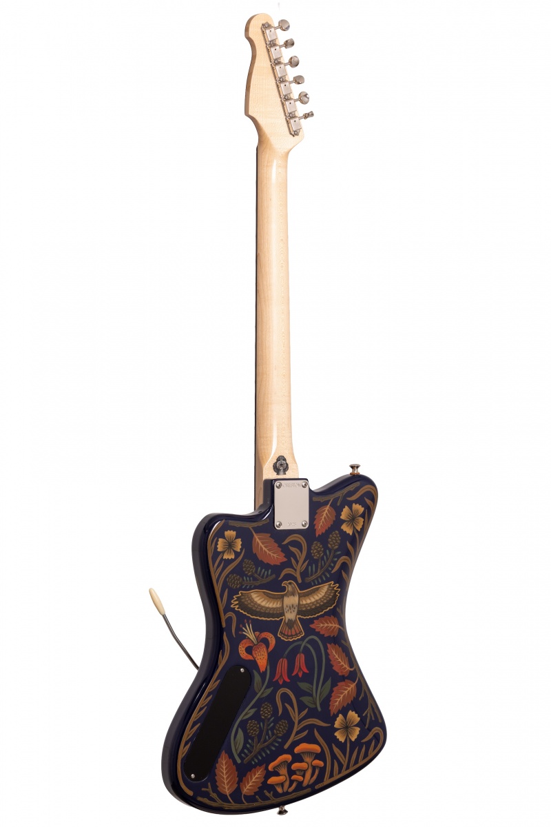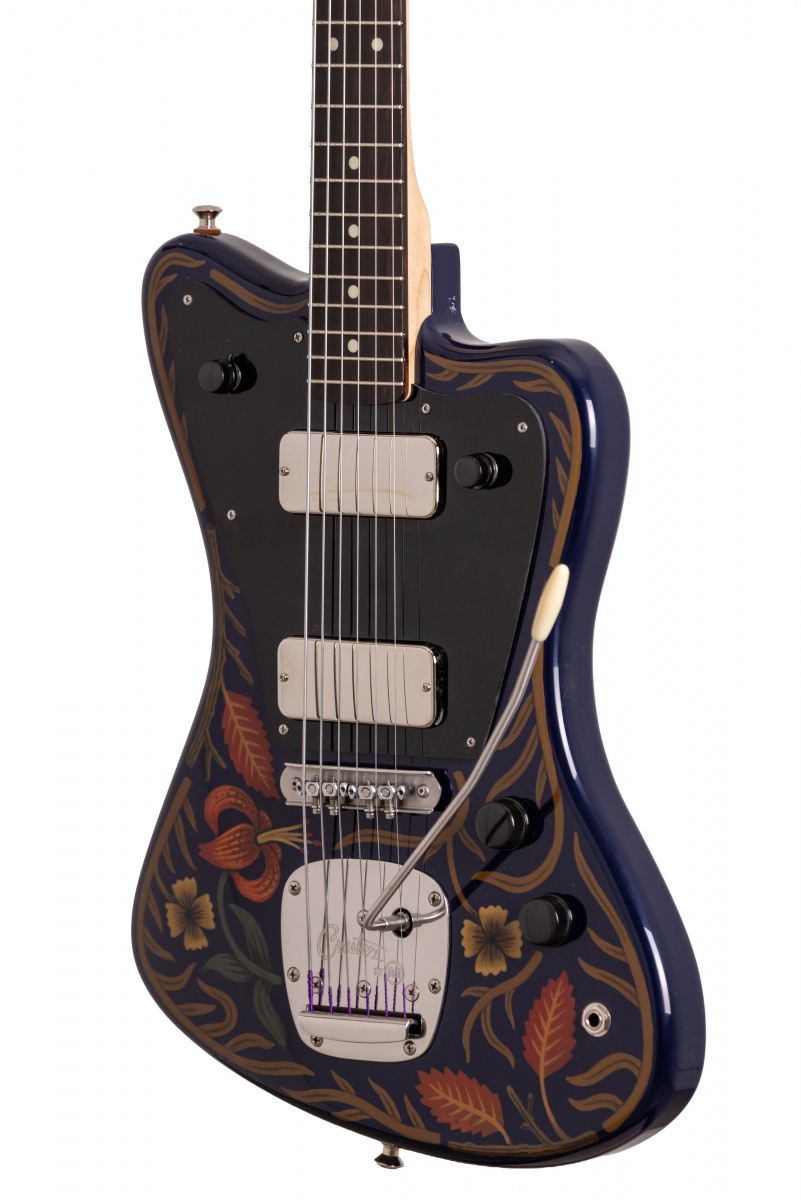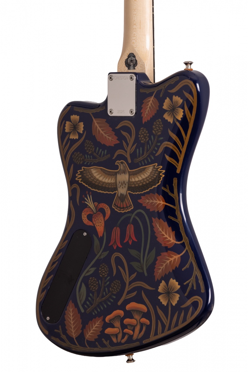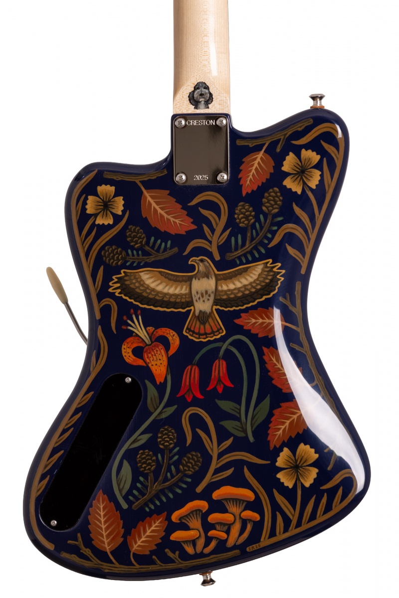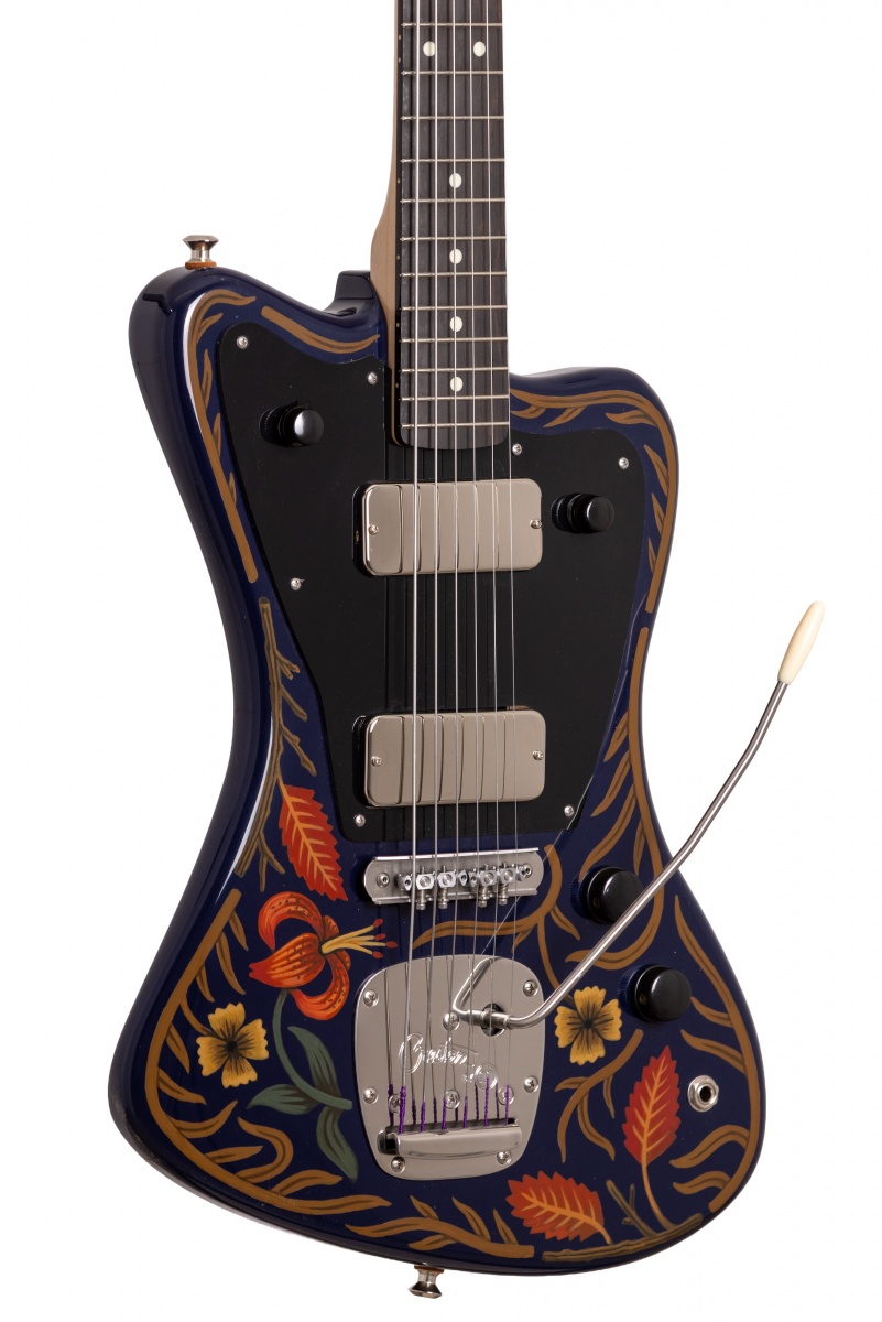 Nick Piazza's Monster: 26-3/4" scale, tuned B-B, torrefied alder body, quartersawn maple / ebony neck, Lollar Thunderbird pickups, rotary pickup selectory switch, Mastery bridge and vibrato, LaBella flats, ferocious on-board 1-knob fuzz circuit, Sarah Ryan paint over navy blue lacquer.