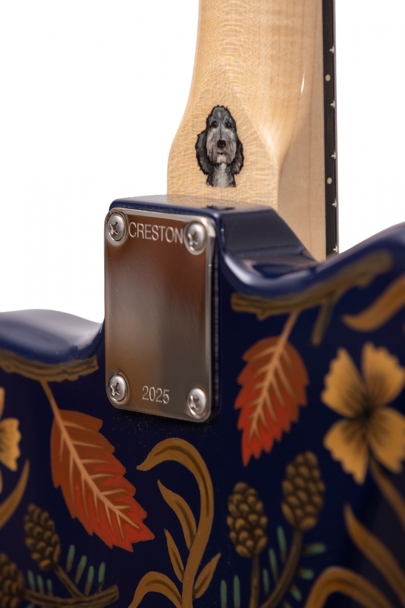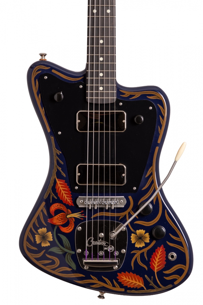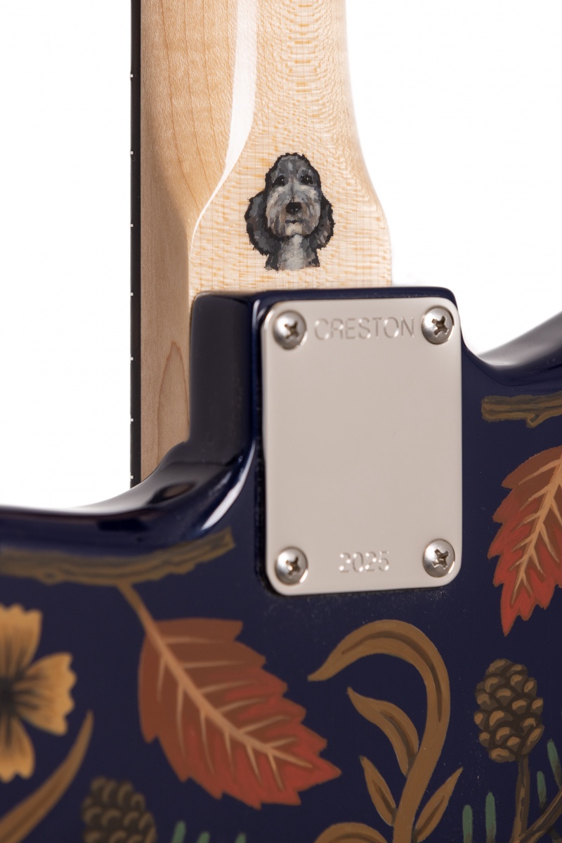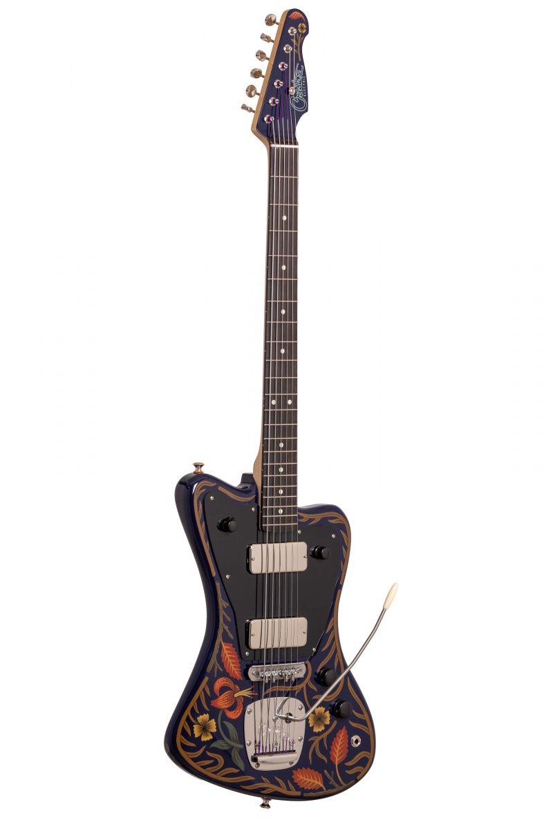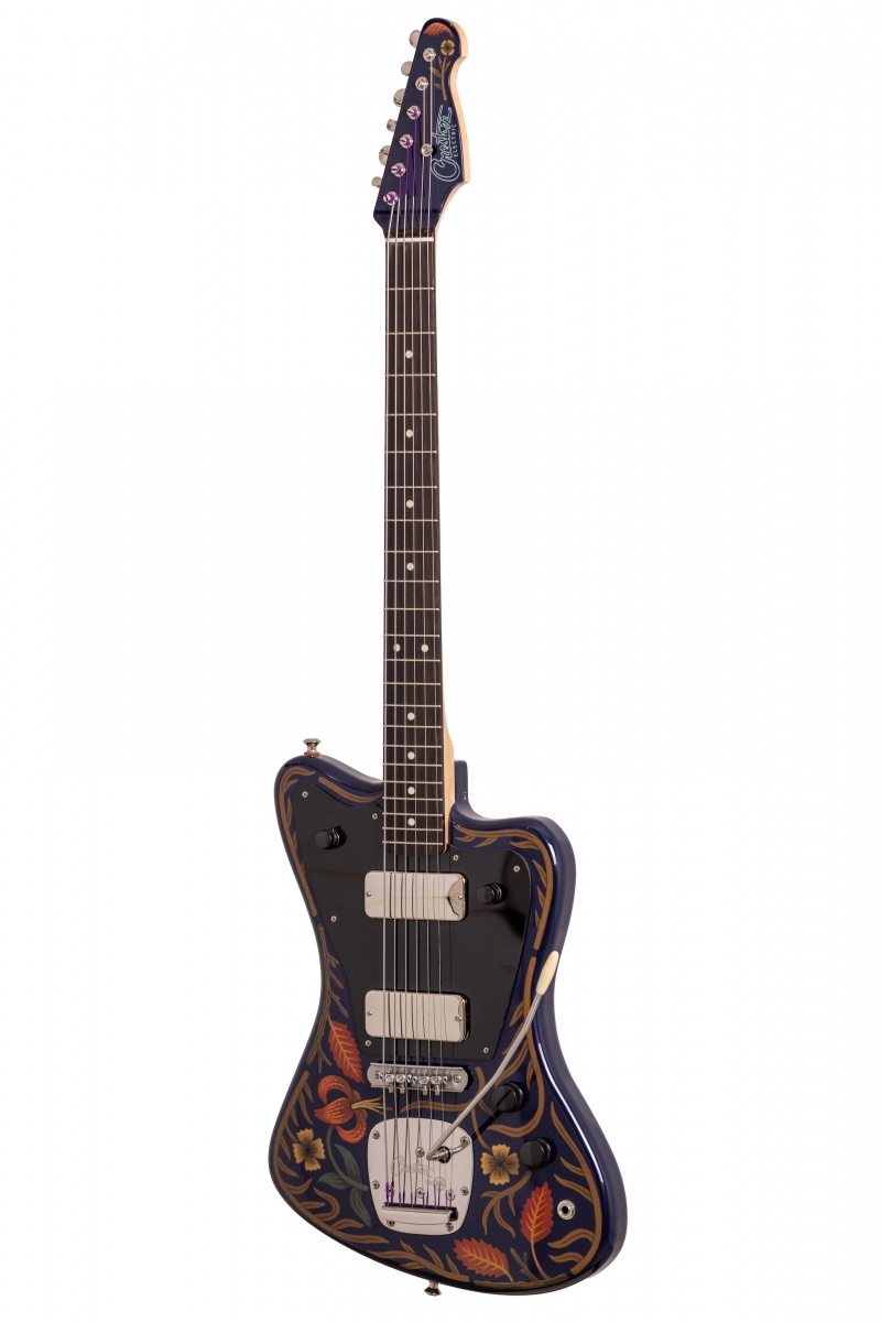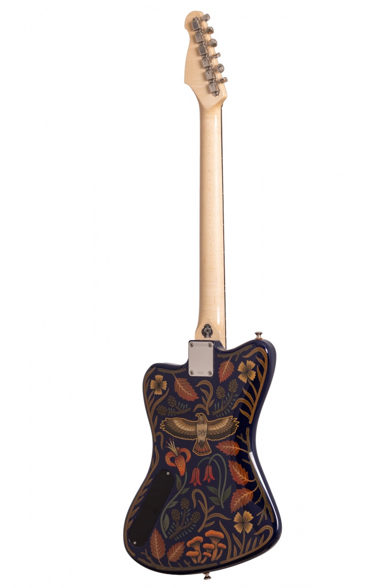 Nick Piazza's Monster: 26-3/4" scale, tuned B-B, torrefied alder body, quartersawn maple / ebony neck, Lollar Thunderbird pickups, rotary pickup selectory switch, Mastery bridge and vibrato, LaBella flats, ferocious on-board 1-knob fuzz circuit, Sarah Ryan paint over navy blue lacquer.