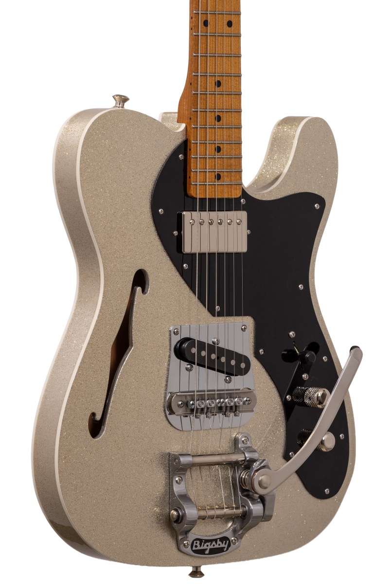 Rich Harries' guitar: chambered and bound alder body, quartersawn maple / Indian rosewood neck, Lollar Special and El Rayo pickups, Mastery bridge, Bigsby B5 vibrato, champagne metal flake over Inca Silver.
