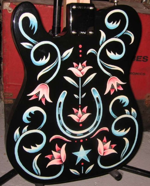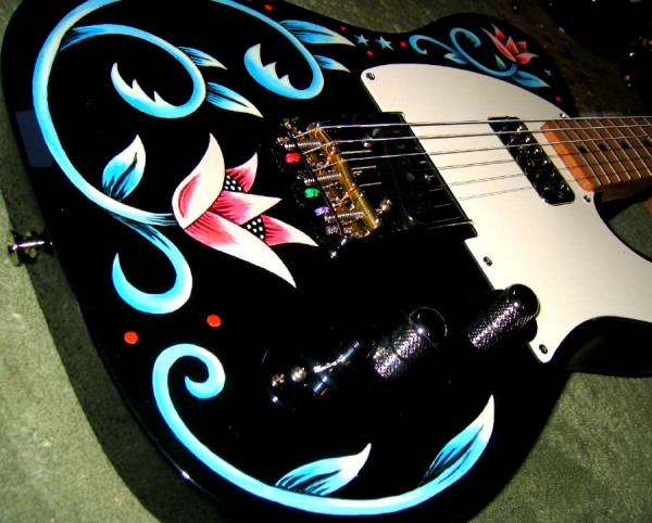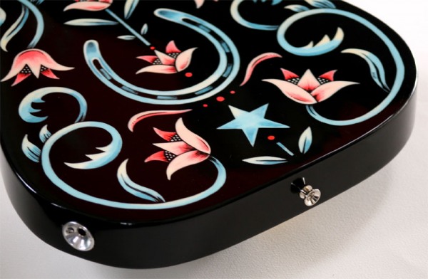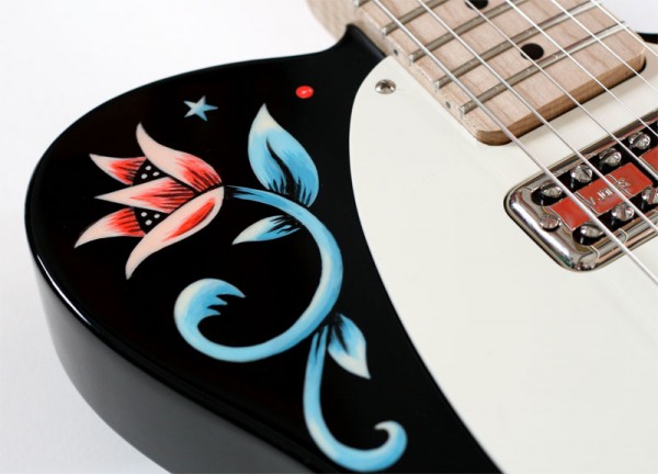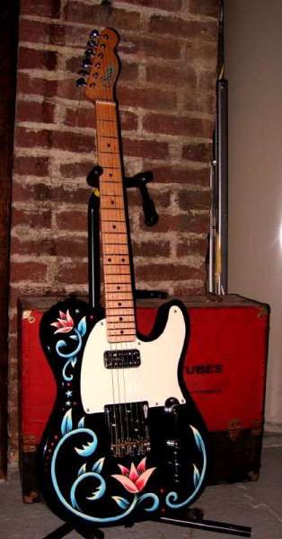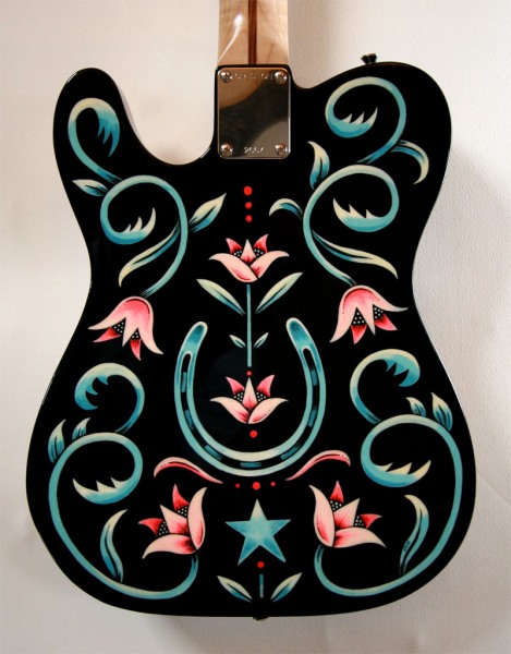 #2 in the series of Sarah Ryan hand-painted guitars. 1-pc sugar pine body with a Lollar Special in the bridge and a TV Jones TV Classic in the neck. Curly maple neck and nitrocellulose lacquer.