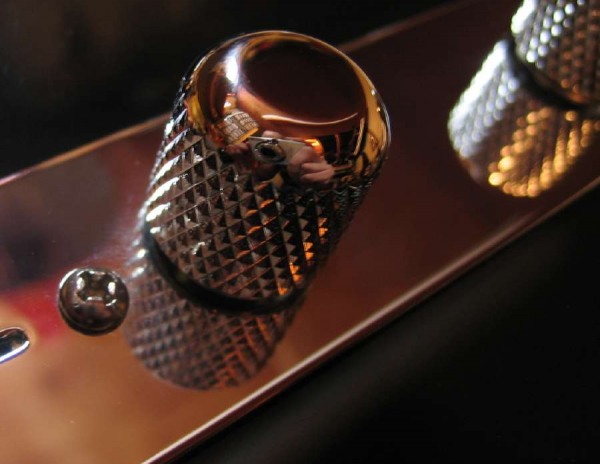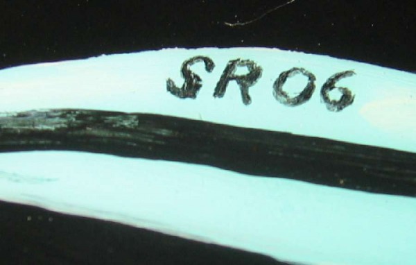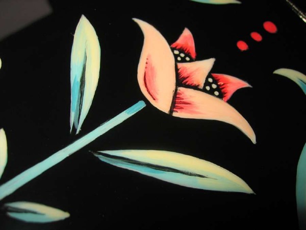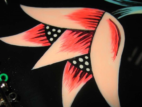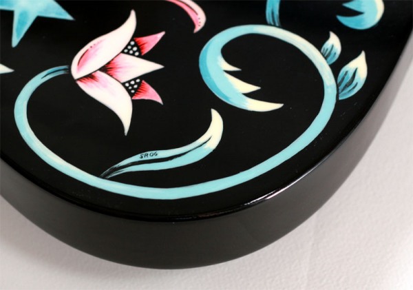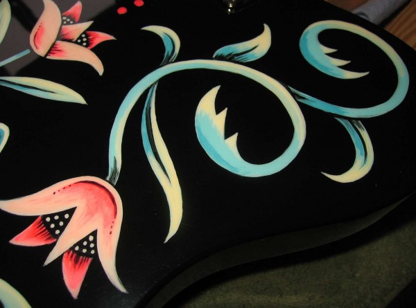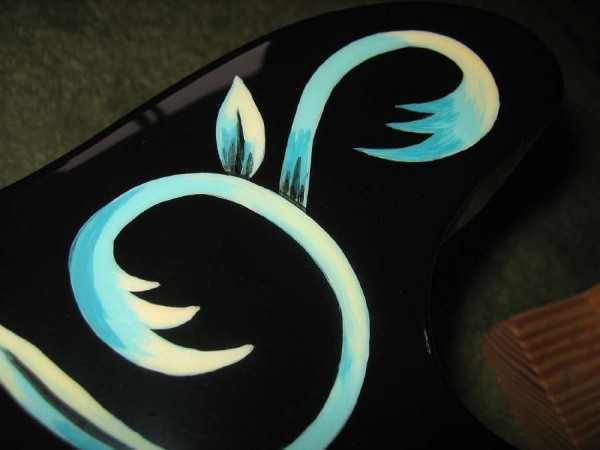 Hand-painted by Sarah Ryan. Nitrocelluose lacquer black and clear coats.