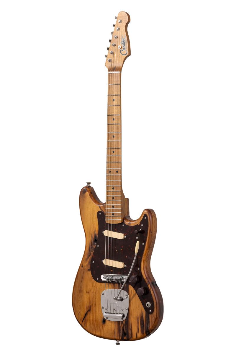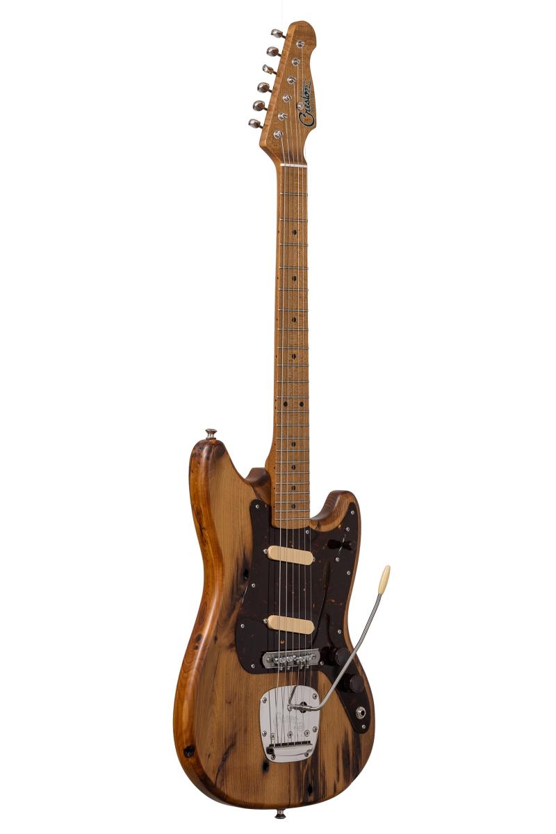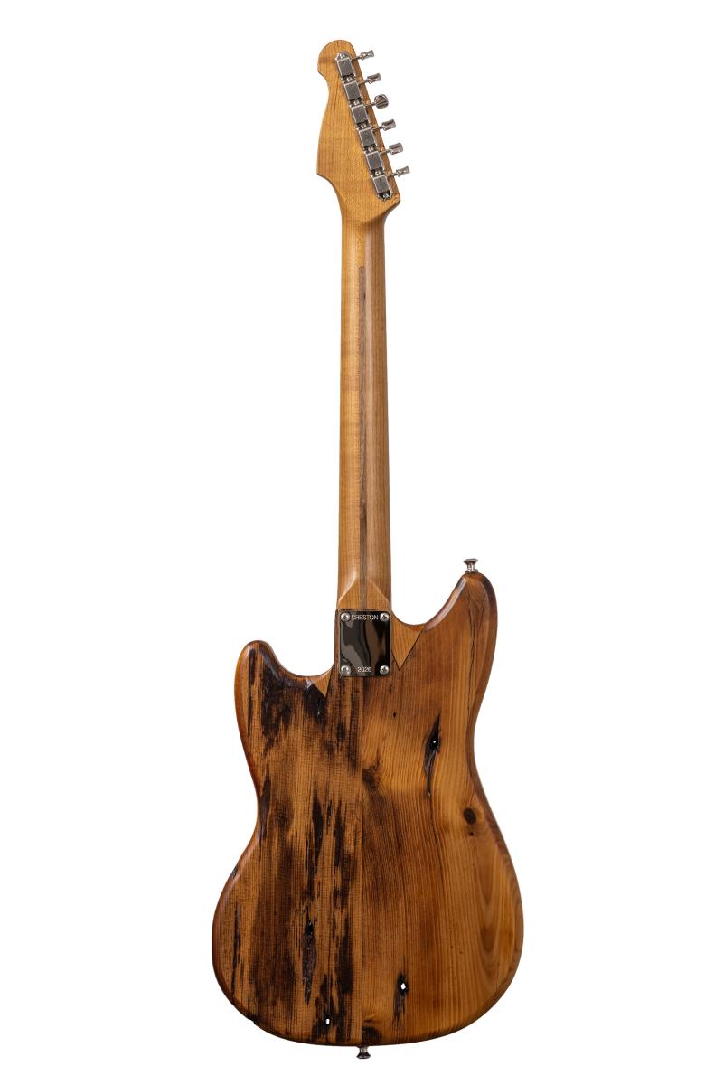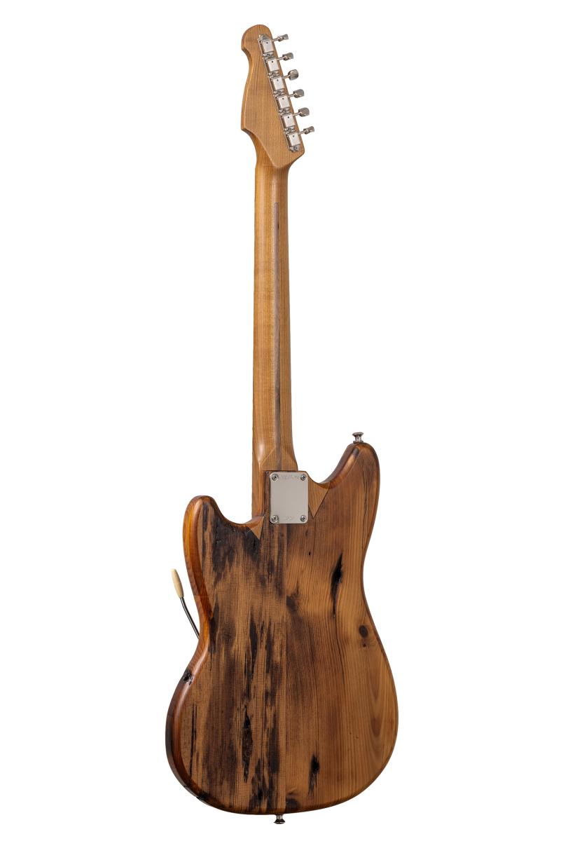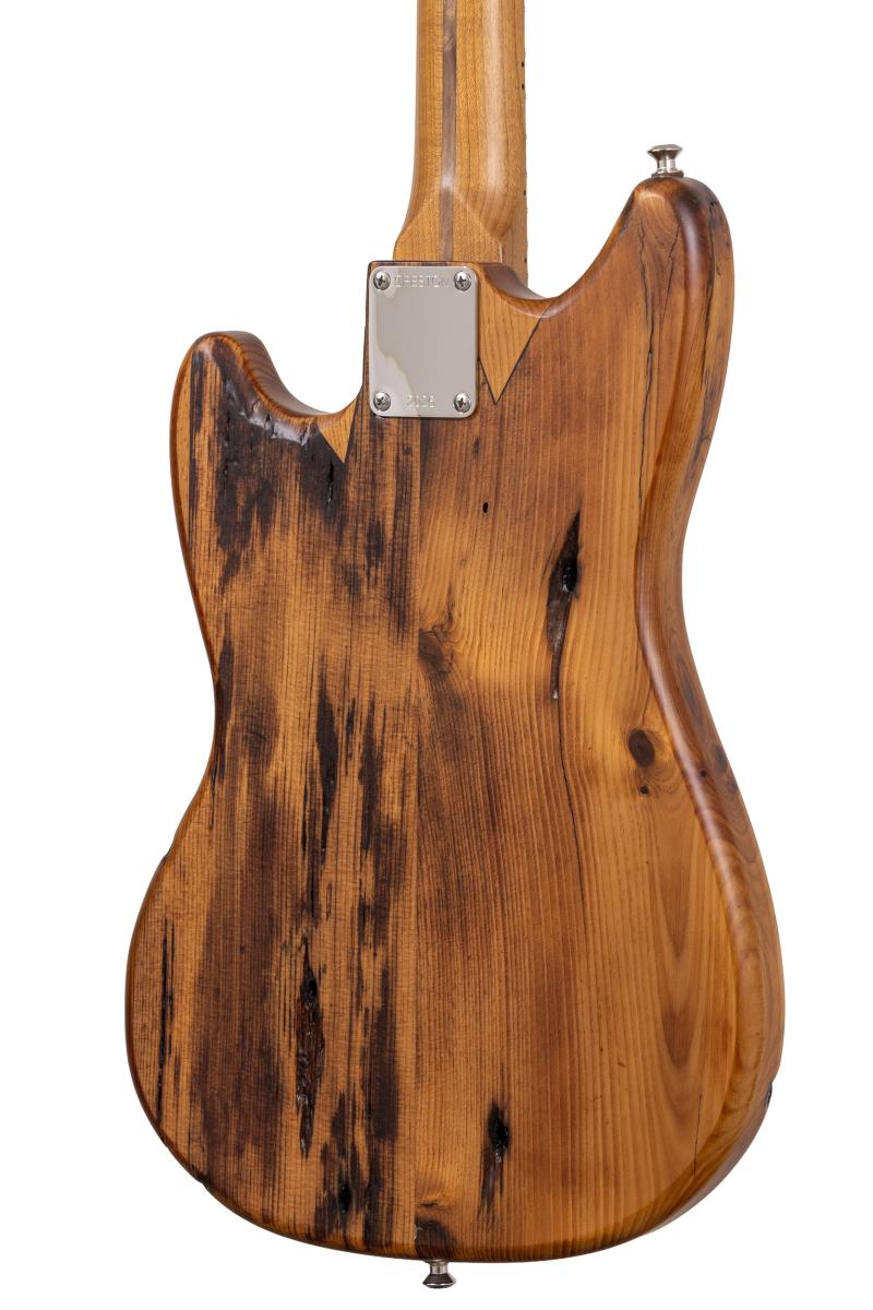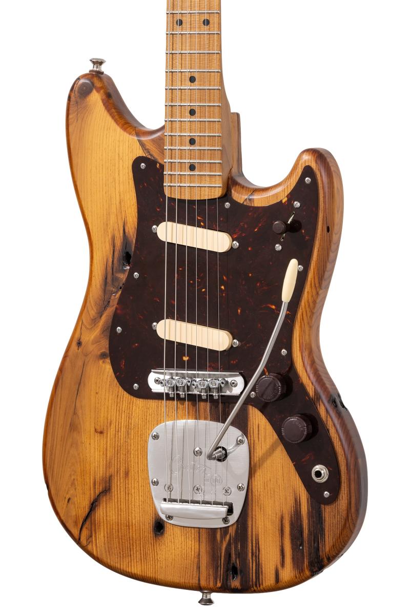Nitsuh Abebe's guitar: 24" scale, torrefied salvaged white pine body, torrefied quartersawn maple neck, celluloid tortoise pickguard, Lollar Special Mustang pickups, Mastery bridge and vibrato, vintage bakelite switch knobs, radio knobs. 5-way switching: bridge / series+phase / parallel / series / neck