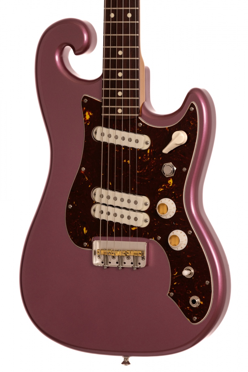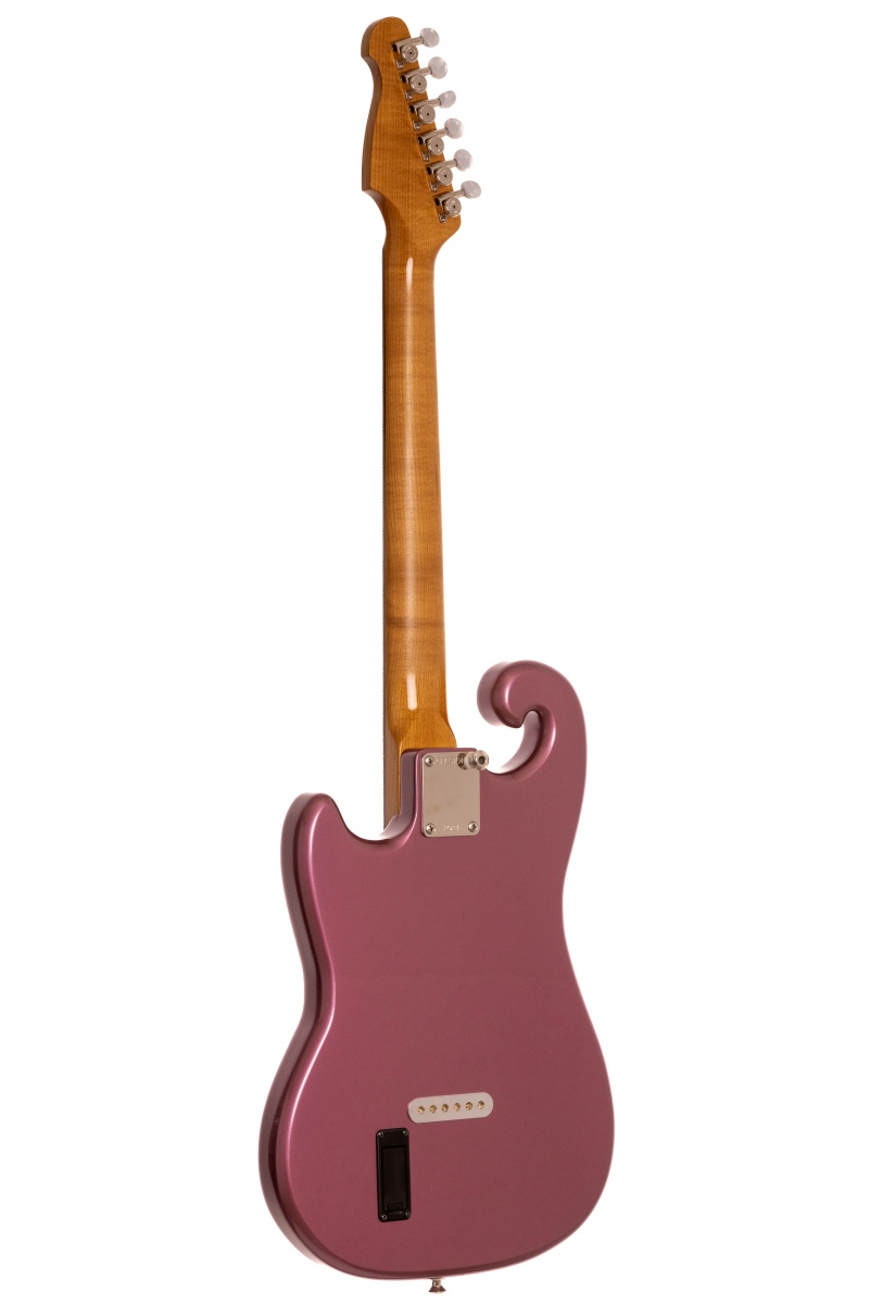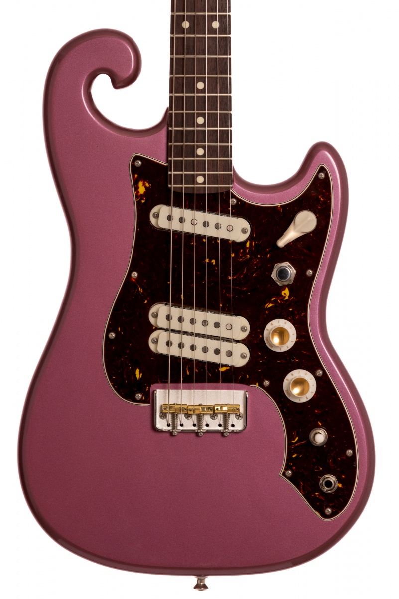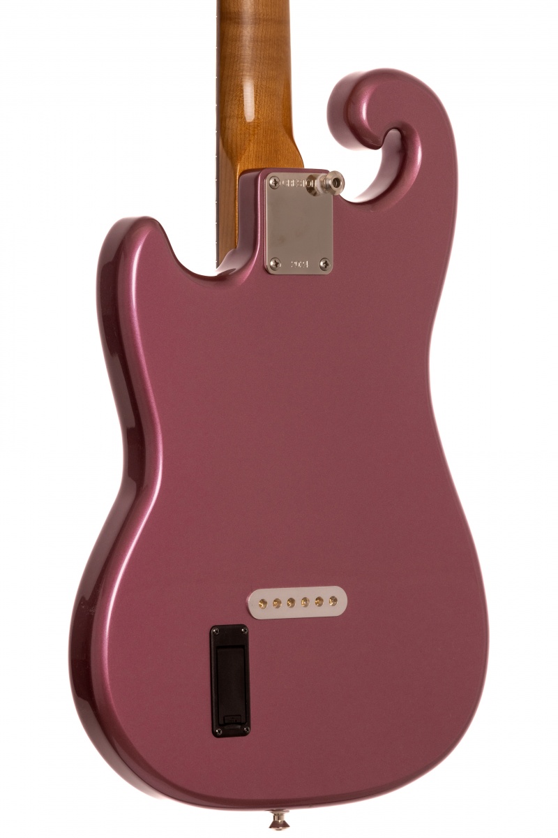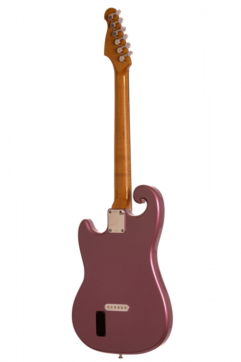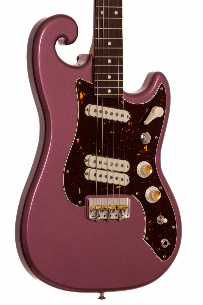 24-3/4" scale, torrefied alder body, torrefied maple / Indian rosewood neck, three Lollar Jaguar pickups, Mythos Blaster Boost (pushbutton on/off switch), three-way rotary (bridge / bridge+middle parallel / bridge+middle series), Hipshot open gear locking tuners with pearl buttons, aluminum de Lisle ferrule block, Burgundy Mist Metallic lacquer.