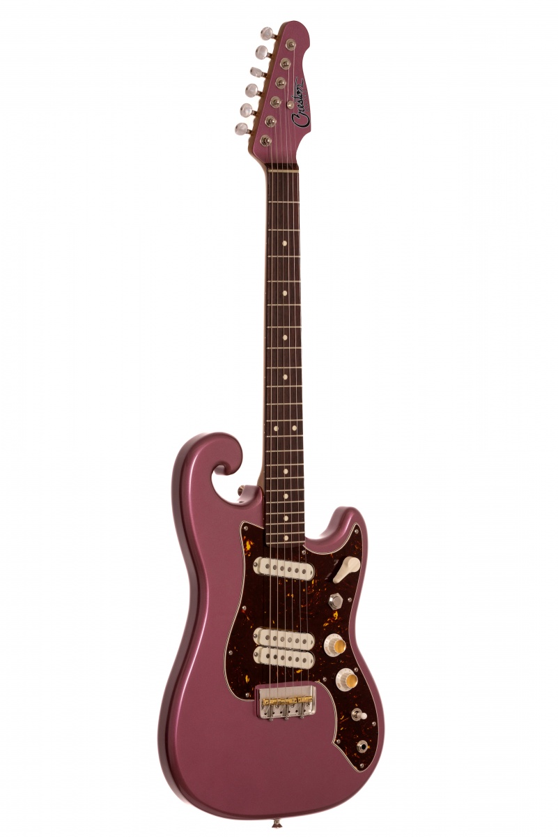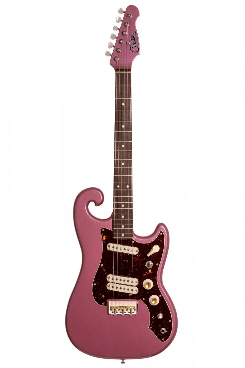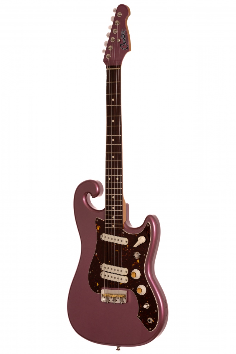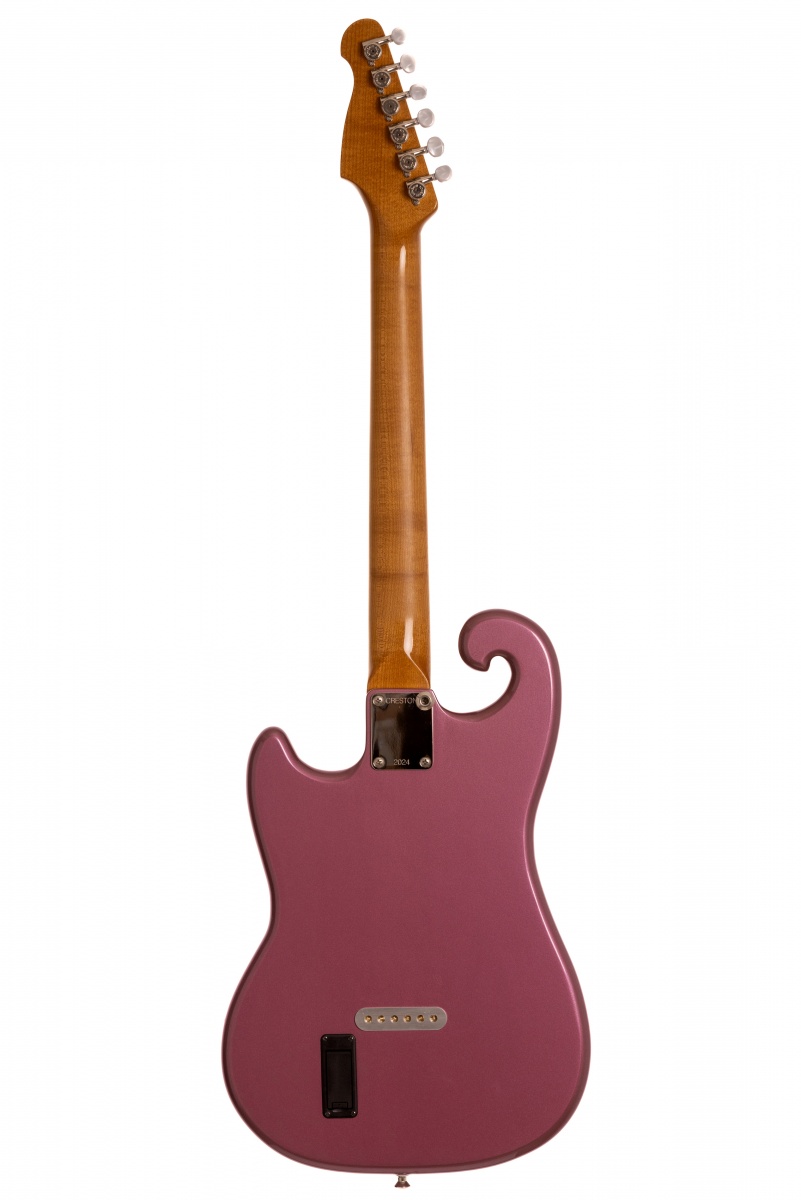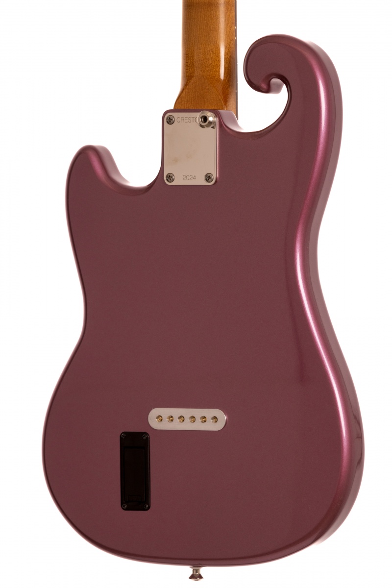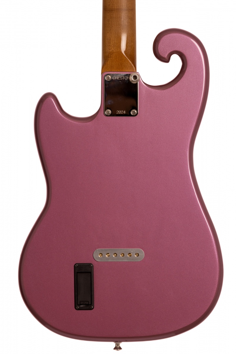 24-3/4" scale, torrefied alder body, torrefied maple / Indian rosewood neck, three Lollar Jaguar pickups, Mythos Blaster Boost (pushbutton on/off switch), three-way rotary (bridge / bridge+middle parallel / bridge+middle series), Hipshot open gear locking tuners with pearl buttons, aluminum de Lisle ferrule block, Burgundy Mist Metallic lacquer.