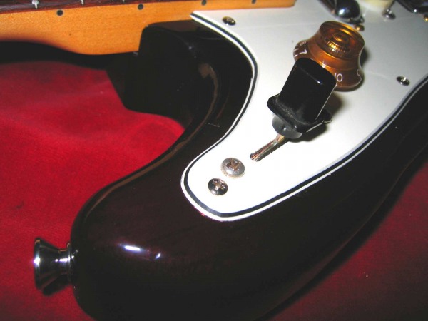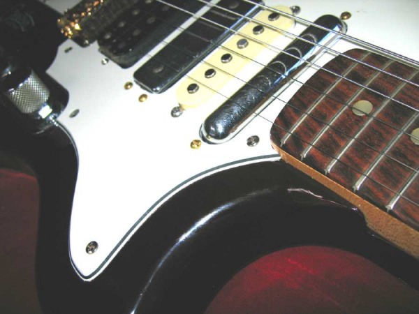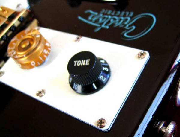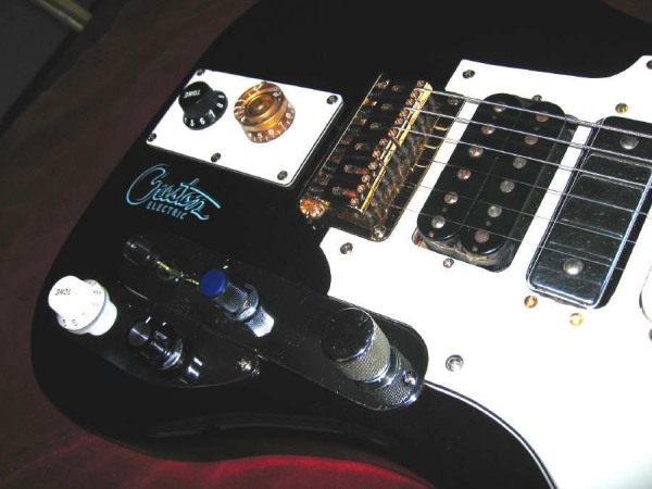 Charvel Humbucker (wound by Abigail Ybarra!), Kay rectangle, Treble generator, Silvertone lipstick pickup, and an $8 ebay bridge.